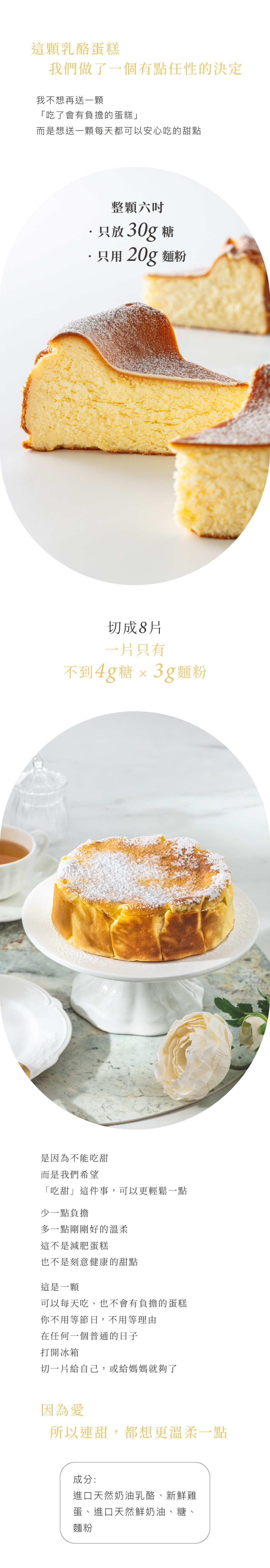 成份 :  進口天然奶油乳酪,新鮮雞蛋,進口天然鮮奶油,糖,麵粉