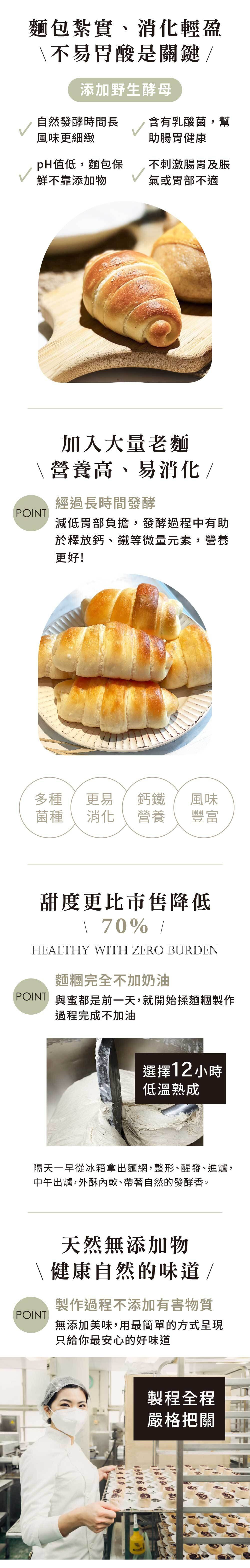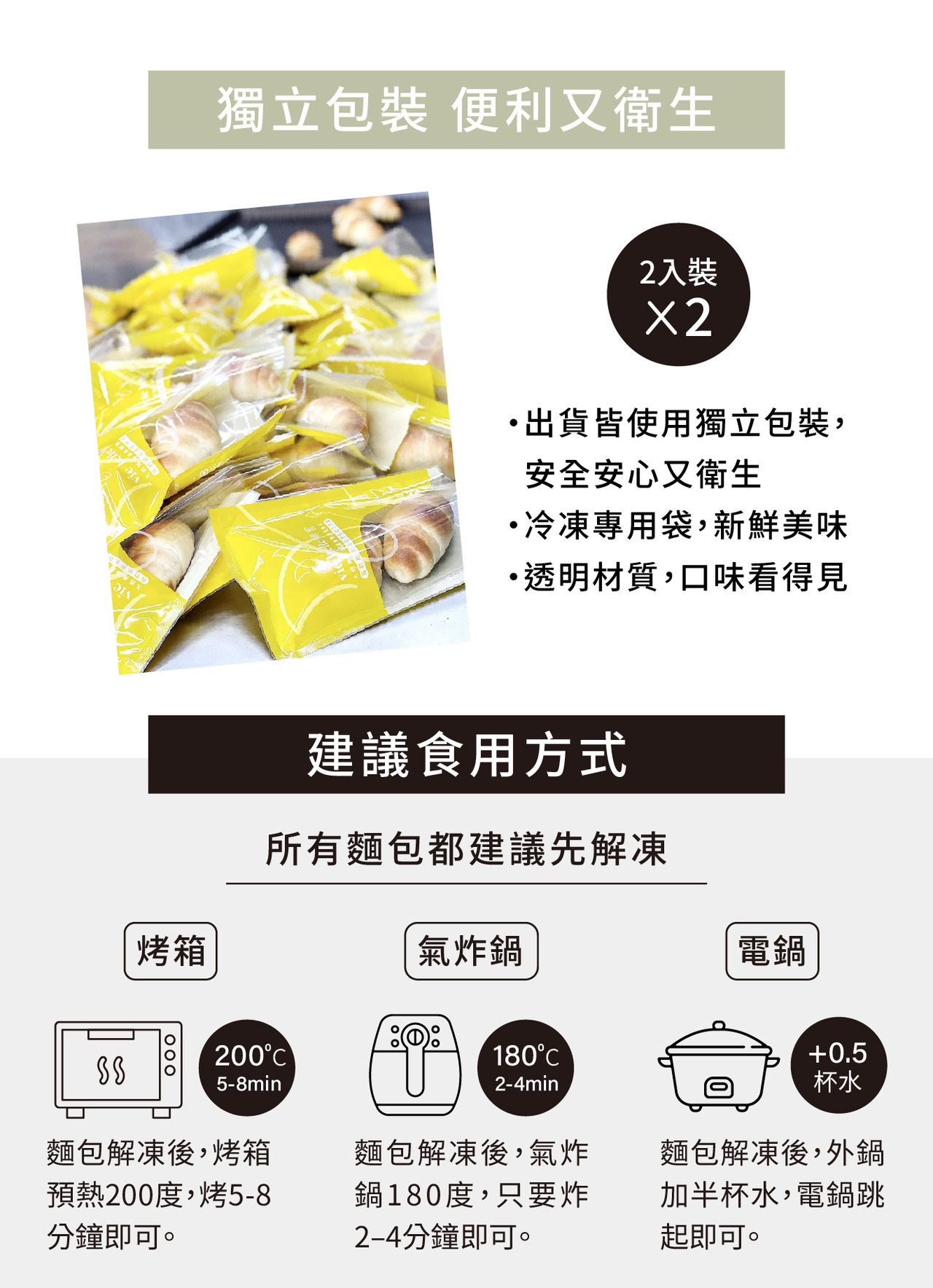 食用方式 : 麵包退回室溫即可以食用,也可以在麵包上噴水,烤箱180度烤3-5分鐘