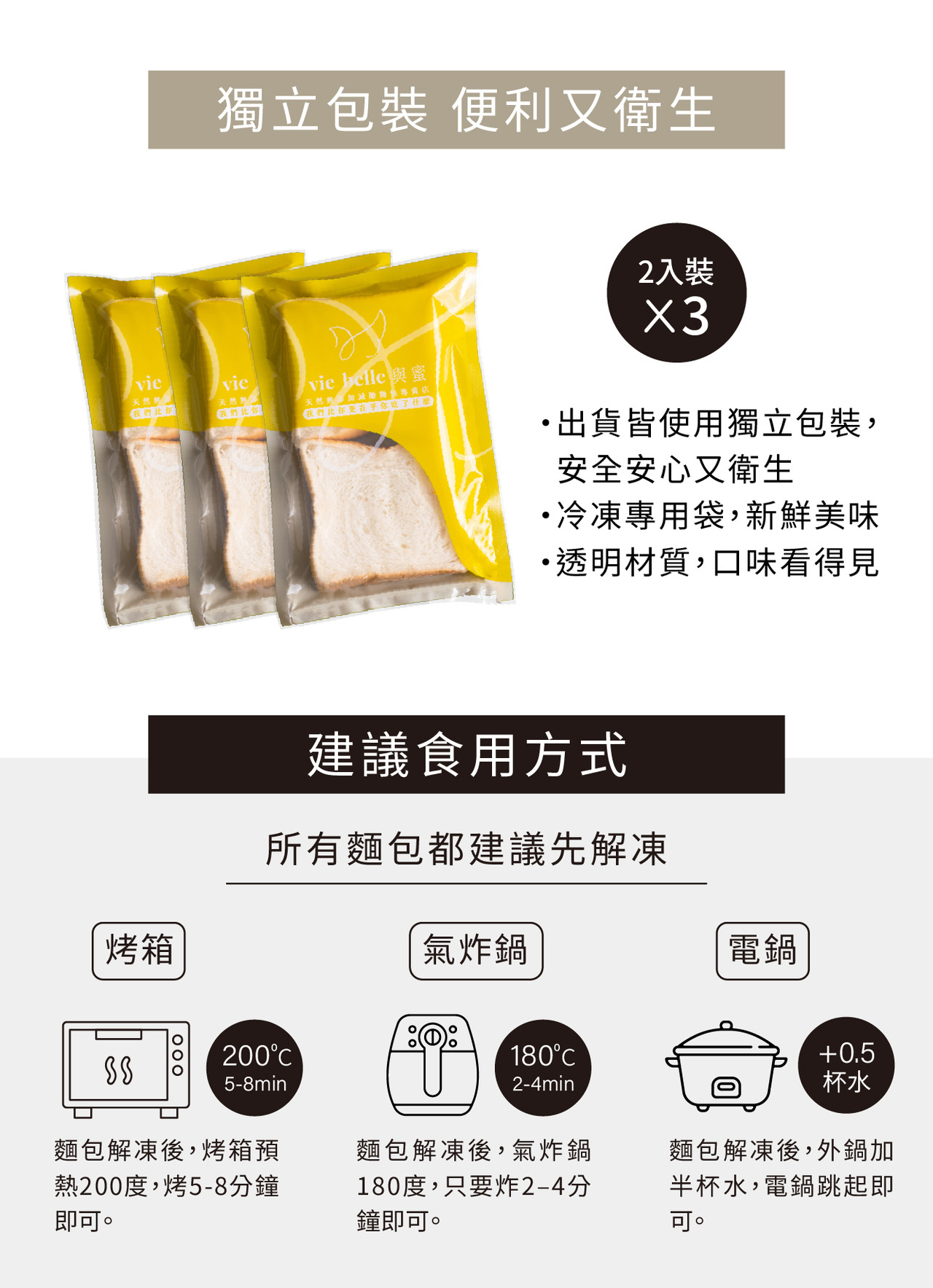 食用方式 : 麵包退回室溫即可以食用,也可以在麵包上噴水,烤箱180度烤1-2鐘